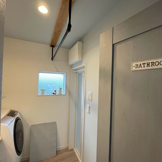 天井と壁1面のクロス張り替えをし、見せ梁を取付てお客様支給品のアイアンのランドリーパイプを取付しました。 洗面台下のスペースに棚板を1段取付して、コンセントを増設しました。 -